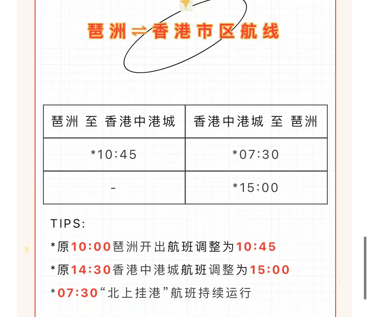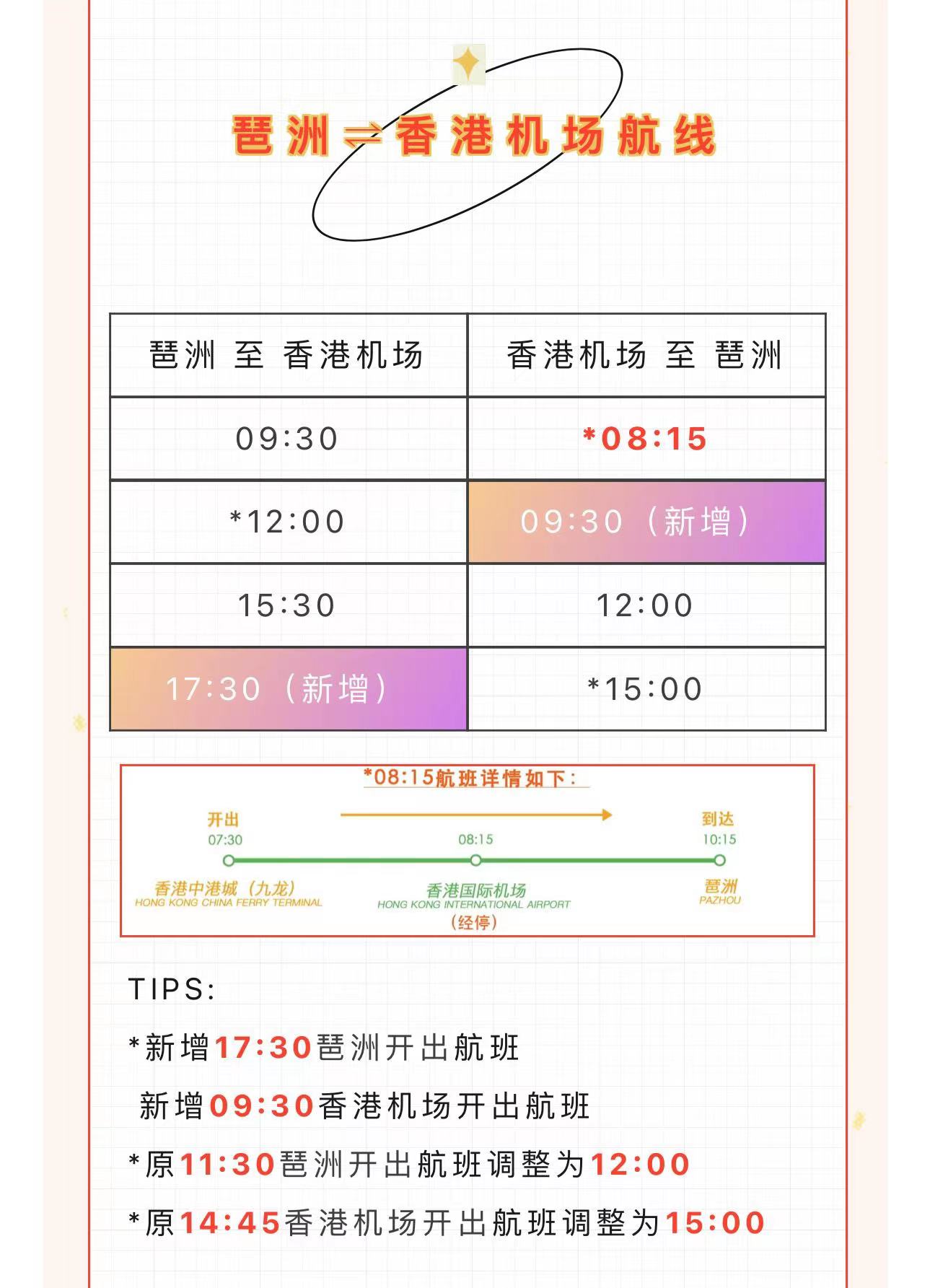 据广州琶洲港澳客运口岸消息,自2023年9月1日起,广州琶洲往返香港机场航线将加密航班,由“三进三出”增加为“四进四出”,增加下午17:30琶洲出发航班以及09:30香港机场开出回程航班。