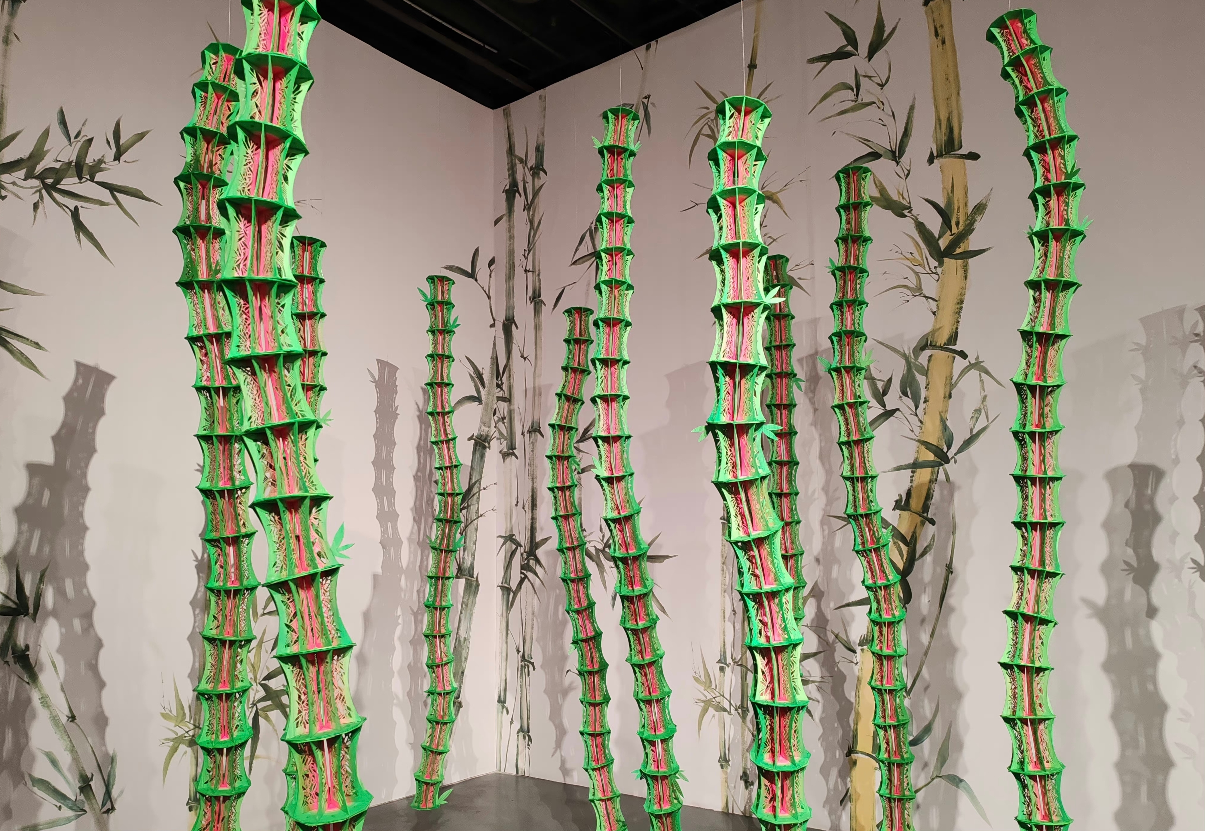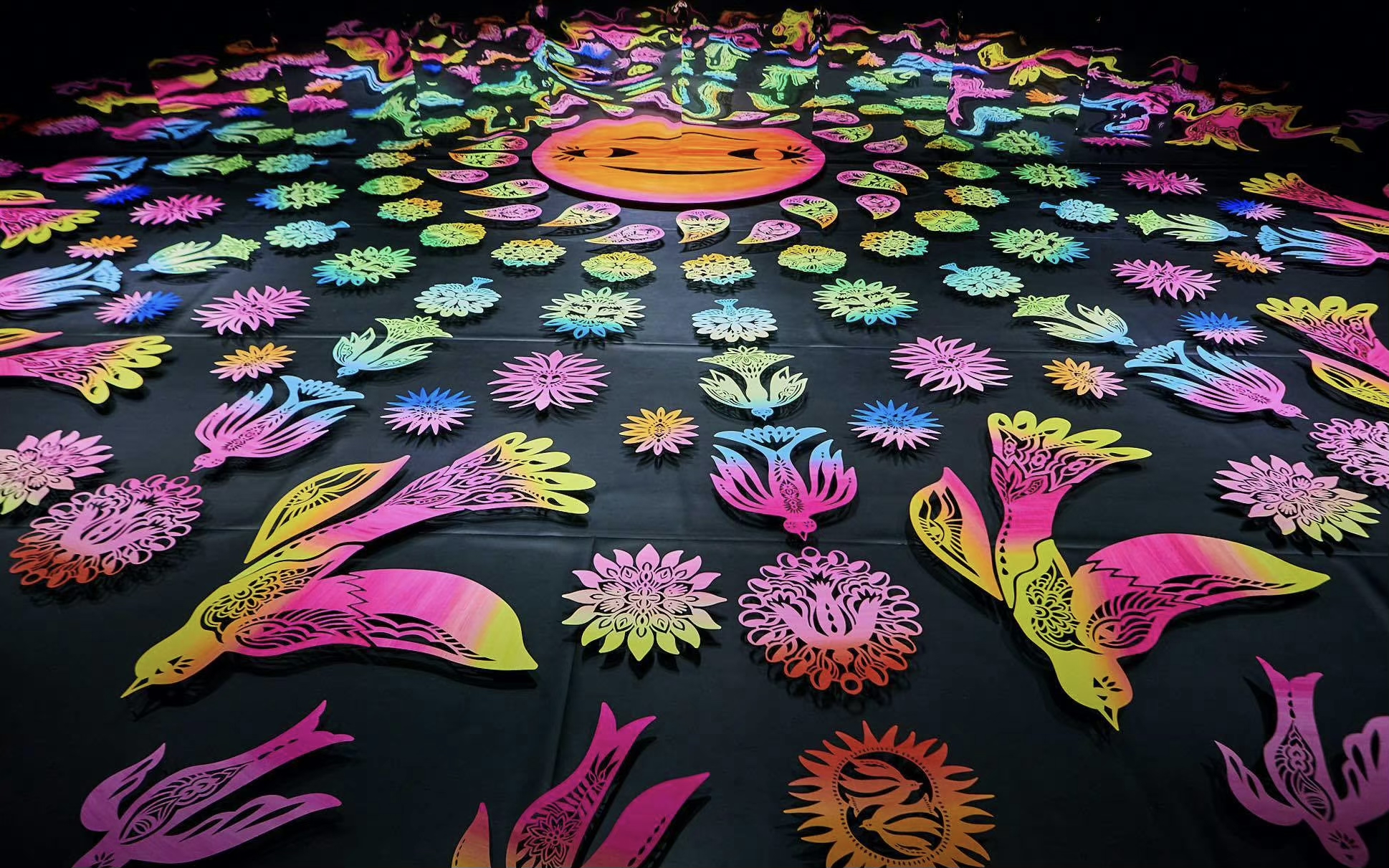 本次展览由陈粉丸剪纸装置代表作之一《不息》、标志性架上作品《对称系列》、以新的记忆和方式联合母亲所创作的《空竹存忆》、最新作品《低头看太阳》等作品组成,通过浪漫的视角重新诠释自然界,见证时间的旋转,从而连接社群中个体之间的情感,构建数个诗意的公共交互空间。