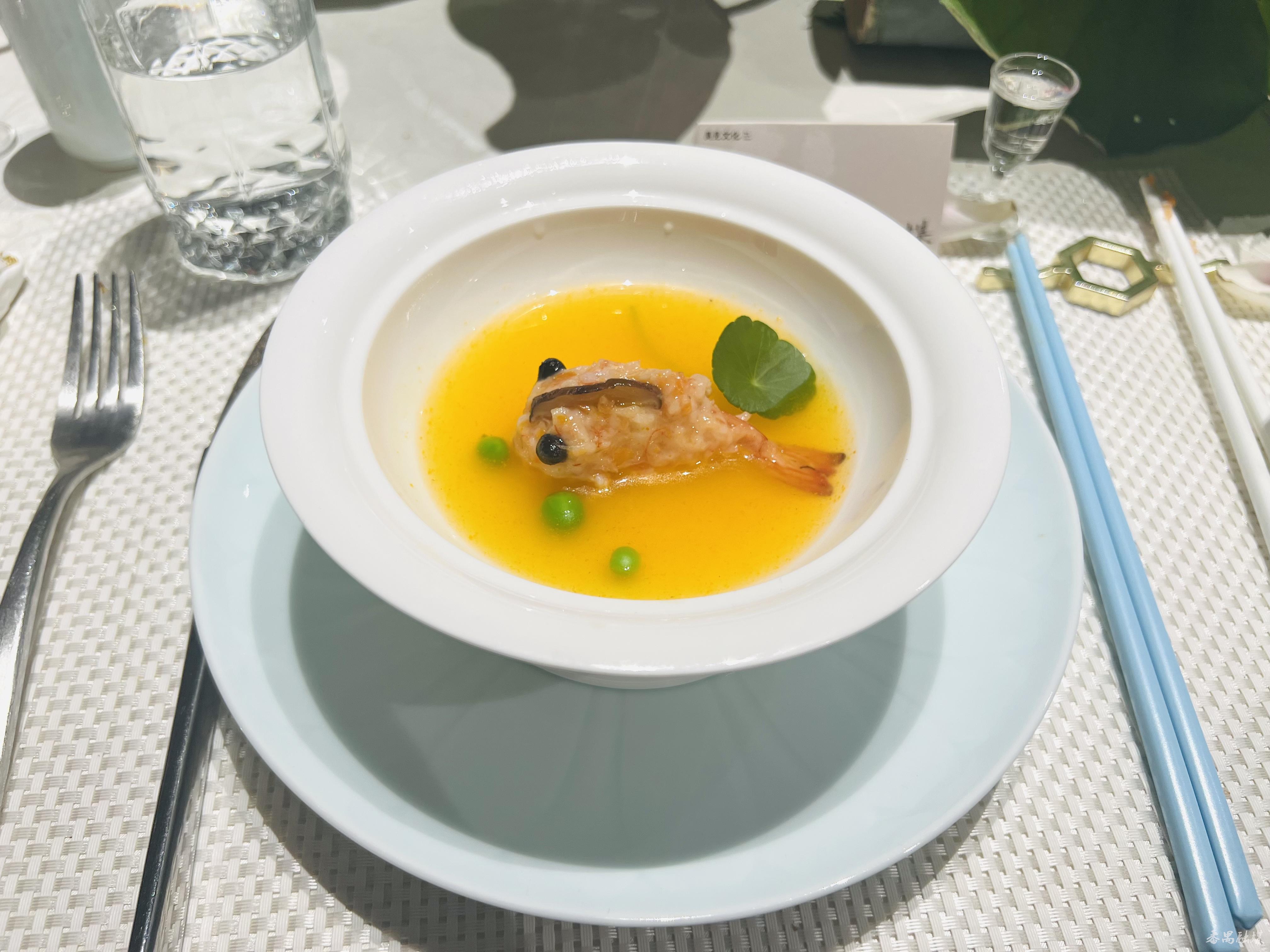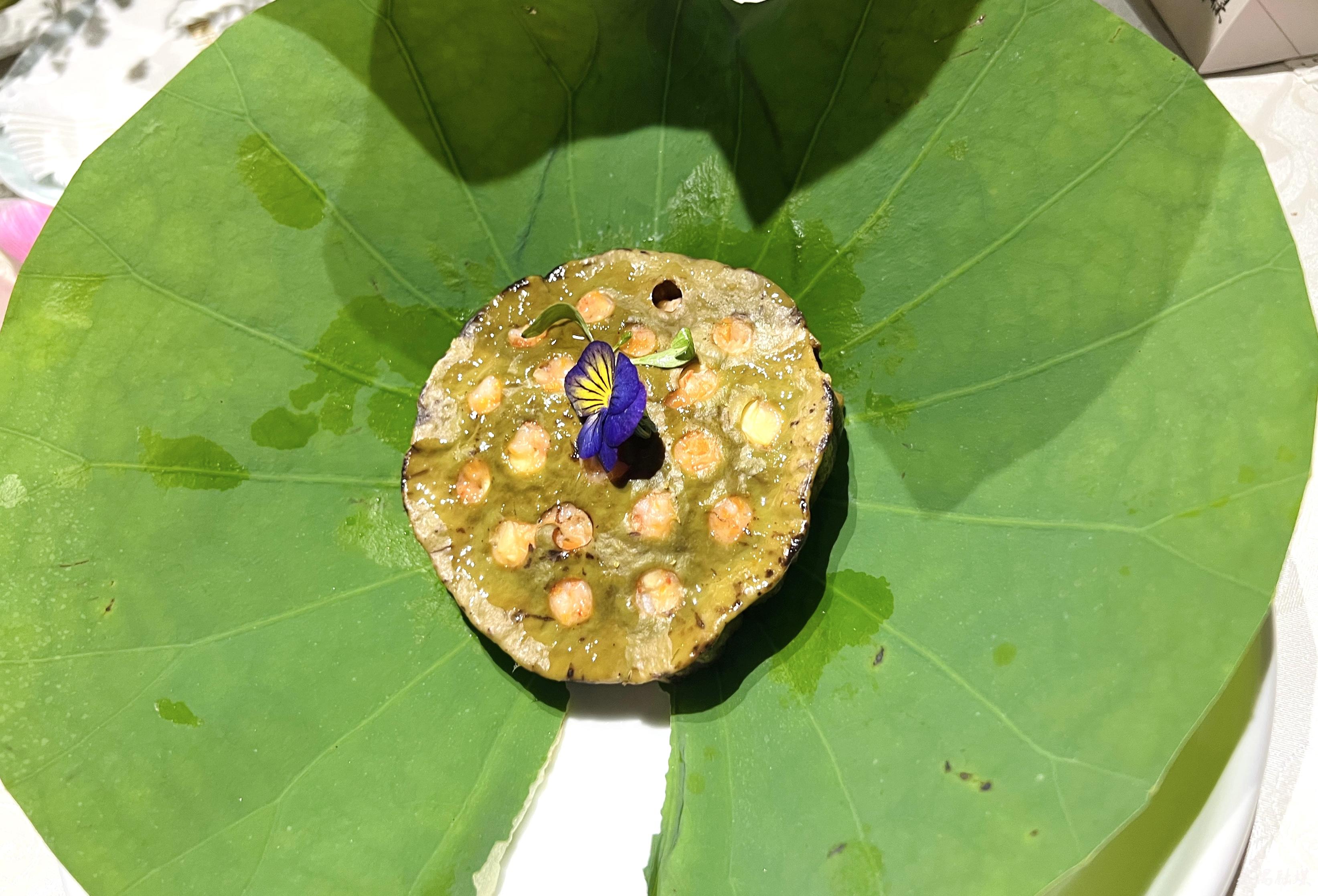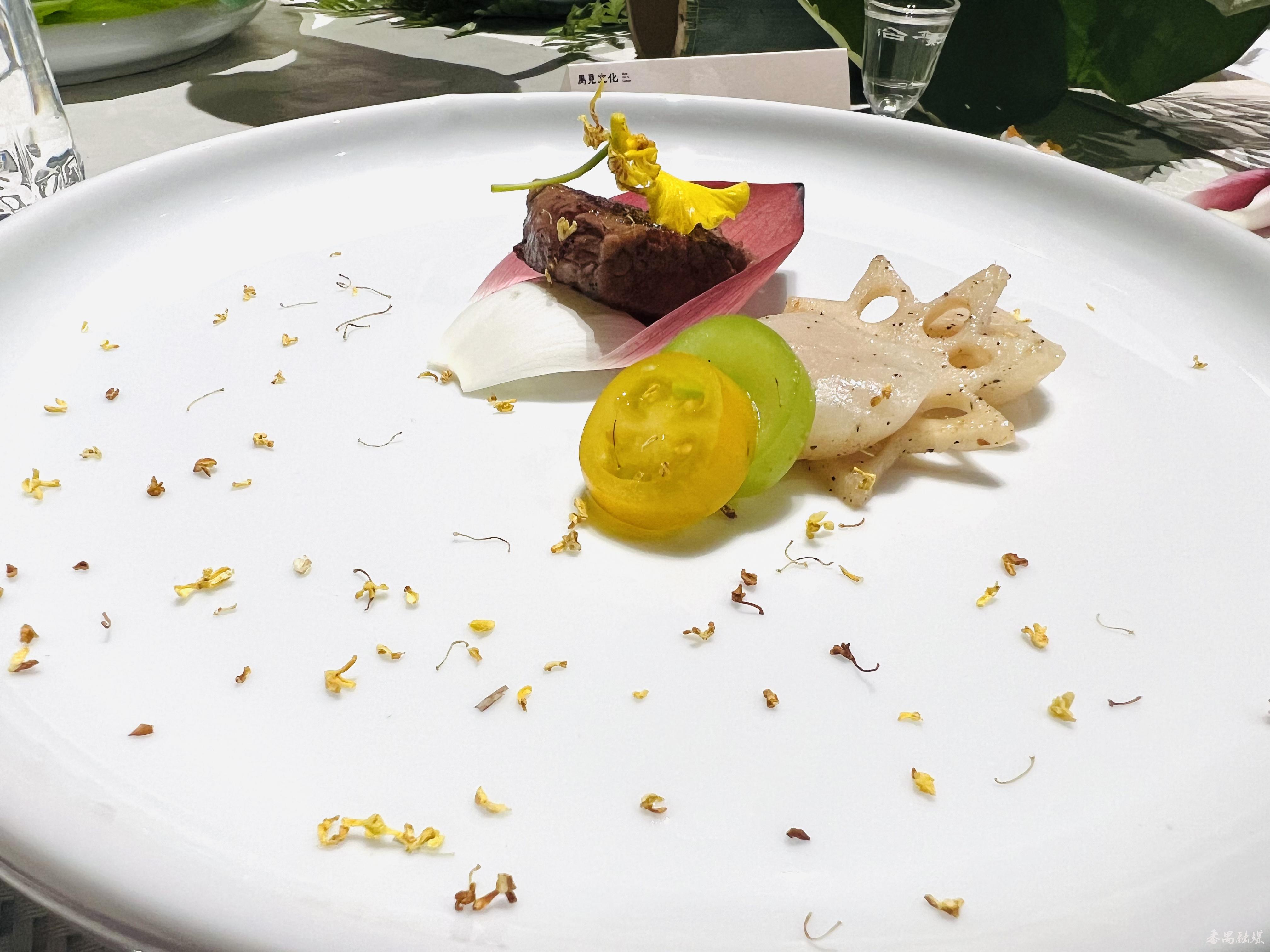 在古乐的和鸣中,宴席开启。禺见艺创中心负责人向大家介绍了以荷花荷叶作为食材的新做法,大家品尝了荷花叶自带的清新味道,体验了一场视觉和味觉碰撞的先锋美学实验。