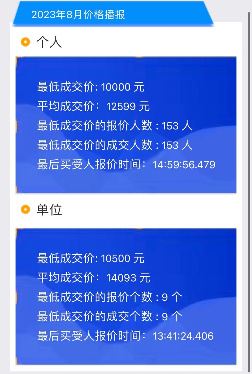 单位竞价方面,2023年8月单位平均成交价为14093元,9个单位以最低成交价10500元成交。7月单位平均成交价为19111元,13个单位以最低成交价10000元成交。