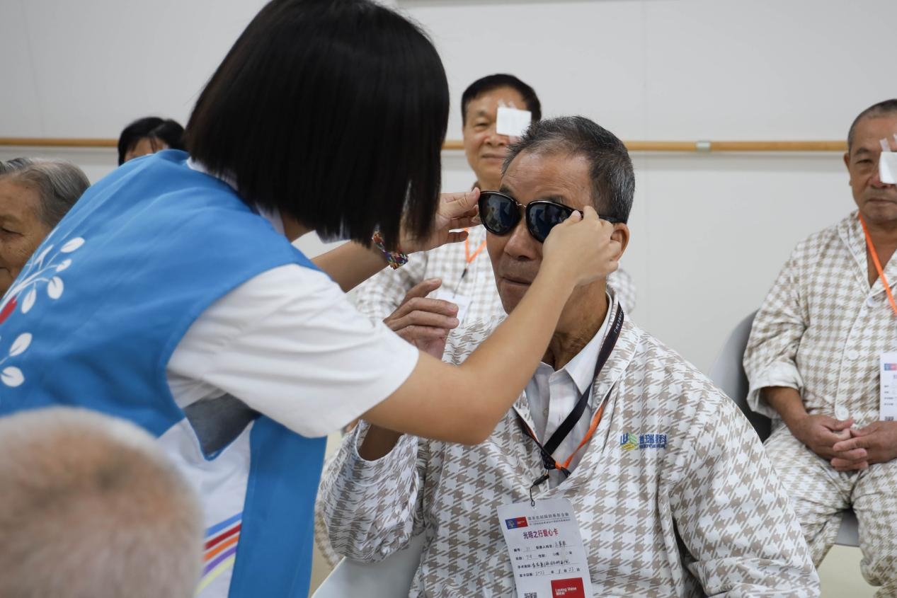 启动仪式上,番禺普瑞为16位老人赠送太阳镜护目,一位大爷把太阳镜戴上再摘下又戴上,开心地说:“戴上去眼睛舒服多了!”同时,护士现场给他们详细讲解术后如何滴眼药水、涂眼药膏,并亲自示范。