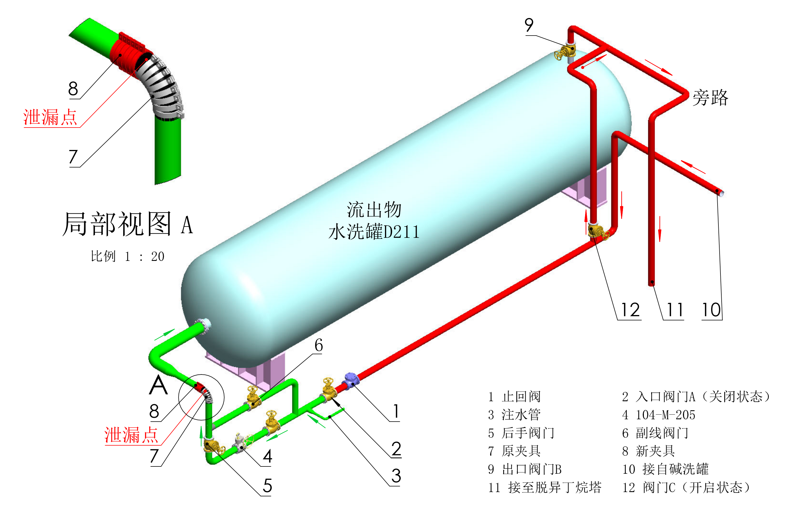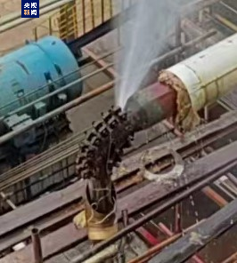 13时24分10秒,在新夹具两侧各安装紧固1套螺栓时,原夹具水平端的管道焊缝处突然断裂,大量介质从断口喷出。现场监护人员立即向外疏散并安排烷基化装置内操人员紧急停车。
