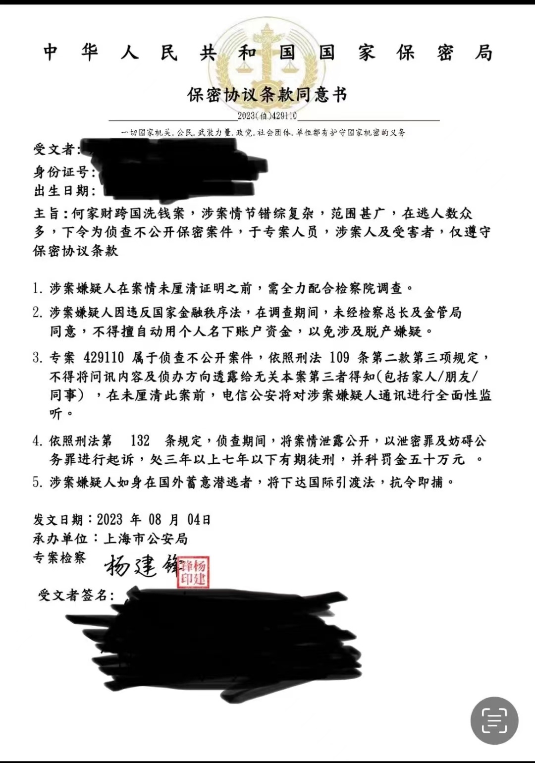 随后,对方又称查询到小语的身份证还涉及一起特大跨国洗钱案件,其身份信息以26.8万元被卖给洗钱团伙且通过其银行卡产生268万元交易。对方不断给小语灌输“你有罪但如果想证明清白就要积极配合调查”、“不然还会影响到以后的人生以及在国内的家人”的思想,小语渐渐陷入骗子的圈套。对方还要求小语在调查期间不得向任何人泄露调查信息,签署一份“中华人民共和国国家保密局的保密协议条款同意书”。