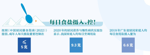 广东省居民家庭人均每日食用盐摄入量均值从2013年的7.3克降低至2018年的6.6克,距离《中国居民膳食指南(2022)》提倡的5克盐还有一定距离。