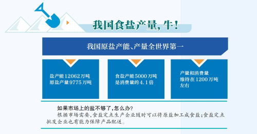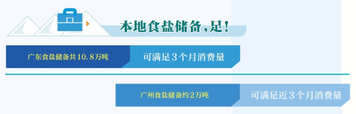 目前,省、市两级食盐政府储备量和企业社会责任储备共10.8万吨,百分百覆盖全省各市县行政区域,能迅速及时响应,保障食盐充足供应。据介绍,目前广东食盐的储备量可满足3个月消费量。广州基地的食盐储备量也可满足正常情况下全市市民近3个月的需求量。