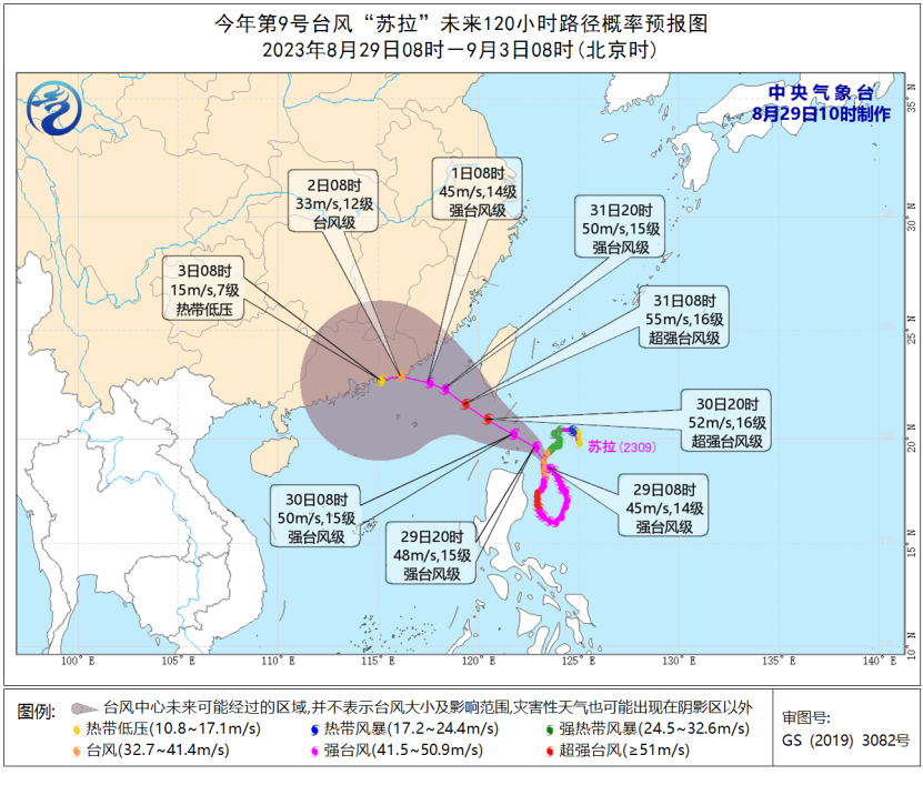据中央气象台消息,预计“苏拉”将以每小时10至15公里的速度向北偏西方向移动,于8月31日早晨移入南海东北部海面,强度将再次增强,并逐渐向福建南部到广东东部一带沿海靠近。