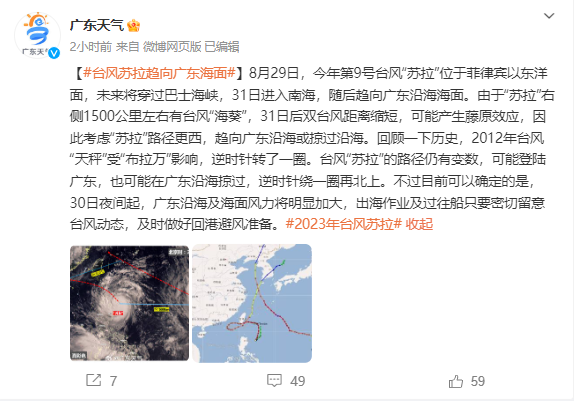 据@广东天气消息,由于“苏拉”右侧1500公里左右有台风“海葵”,8月31日后双台风距离缩短,可能产生藤原效应(双台风效应),因此考虑“苏拉”路径更偏西,趋向广东沿海或掠过沿海。