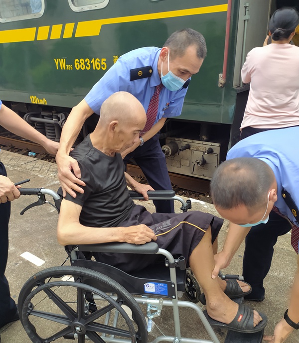 25日13时46分,列车到达广州北站。列车停稳后,列车员方震背着侯大爷下车,王亚提着轮椅和侯女士跟在后面。很快,王亚和车站工作人员办理了交接,顺利将侯大爷交到客运员手中。车厢内其他旅客看到列车员们的服务场景,都纷纷点赞。临别之际,侯女士不停地表示感谢,便出现了开头那一幕。