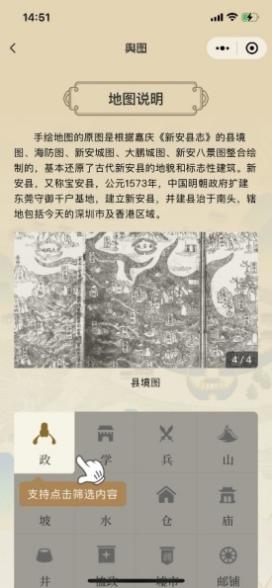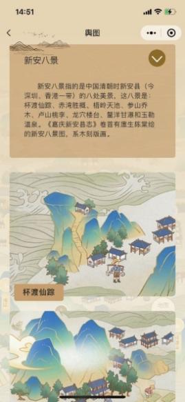 记者点开小程序看到,用户可以在“舆图”里自由探索,点击地名标签展开详情介绍,对比古今地名变化,找寻古代海防印记,领略“新安八景”等风物形胜。