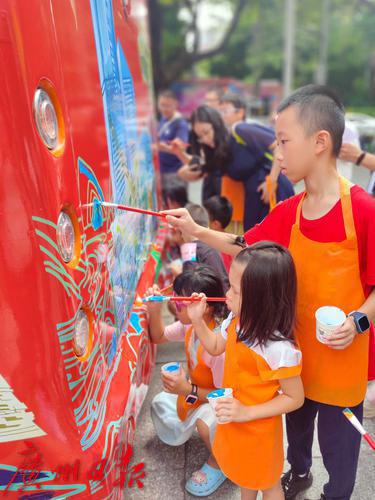 前期,电车分公司招募50多位小朋友参与了“英雄花中华红”主题车涂鸦活动。让孩子们以广州著名地标、羊城元素为创作蓝本,以车身为画纸,描绘他们眼中的绿水青山,进一步用实际行动追寻“红色印记”,传承广州的“红色基因”。
