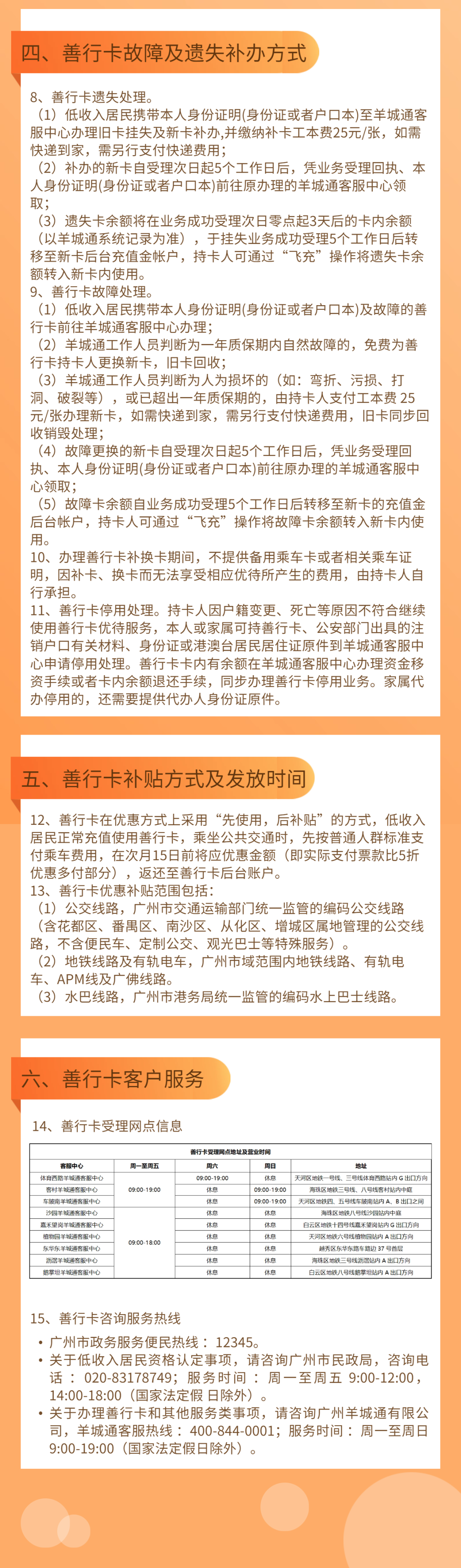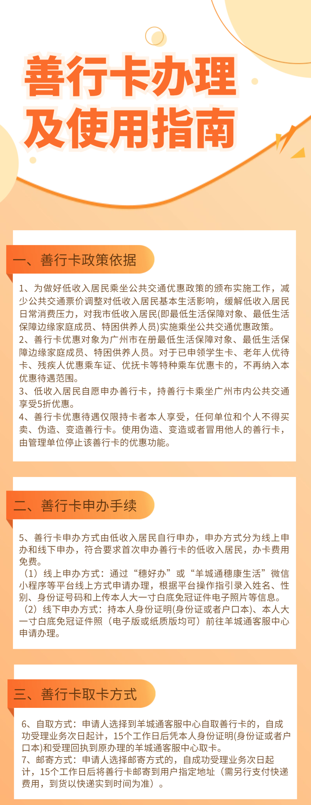 即广州市在册最低生活保障对象、最低生活保障边缘家庭成员和特困供养人员,申办“善行卡”后,持善行卡乘坐广州市域内公共交通享受5折优惠。