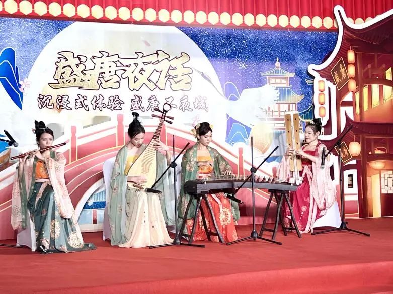 在一开始的百官开市的环节,花魁们在舞台上进行歌曲演奏,琵琶、古筝及箜篌等传统乐器亮相,一曲唐音惊艳全场,正式开启本次活动。