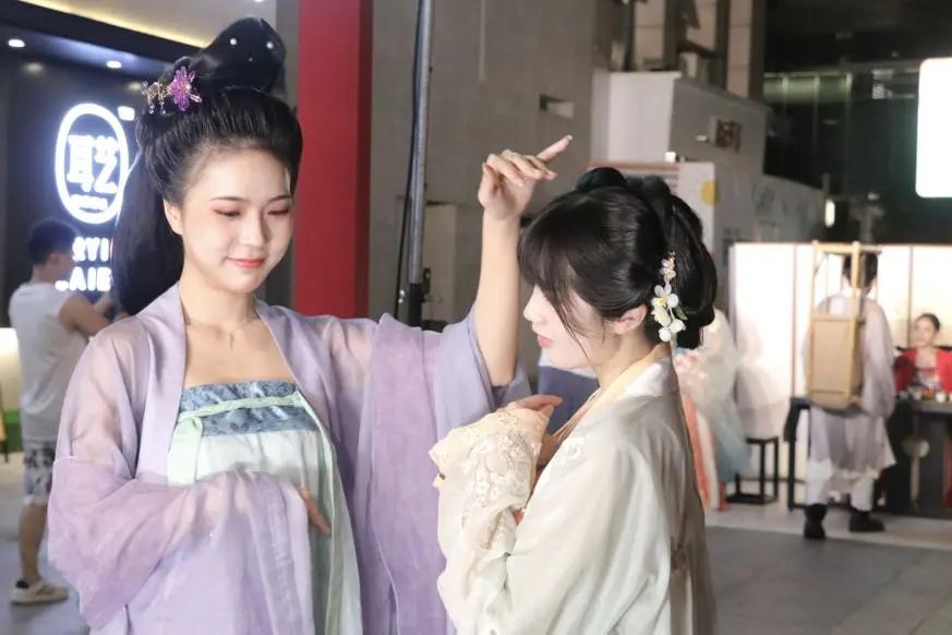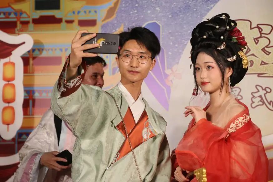 现场还有不少人穿着汉服,他们举手投足间尽显中华文化之美,展示出中华传统服饰独特的韵味和美感。