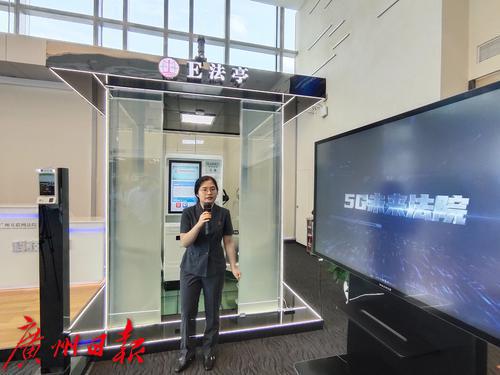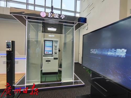 广州互联网法院,工作人员介绍E法亭和5G未来法庭。
