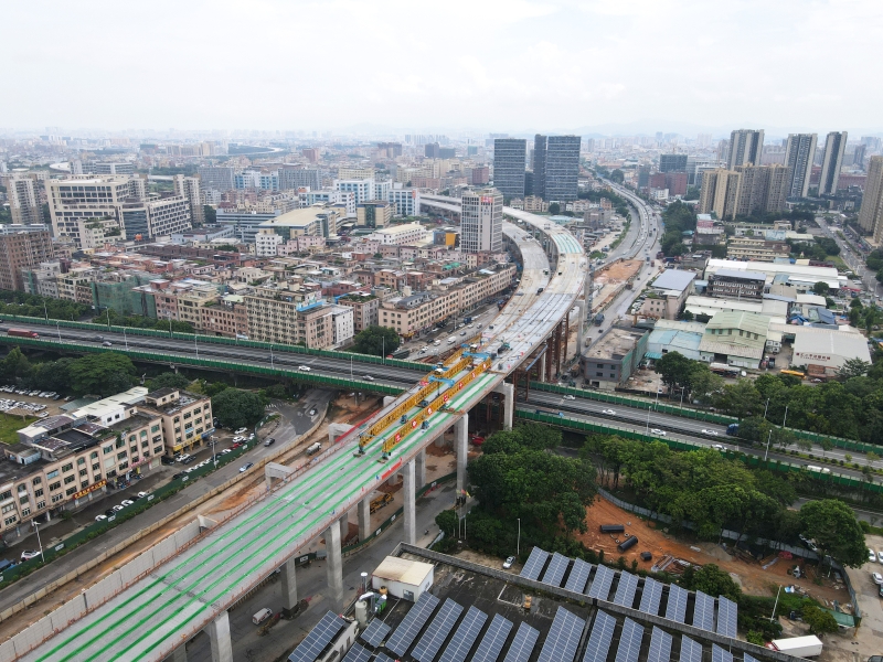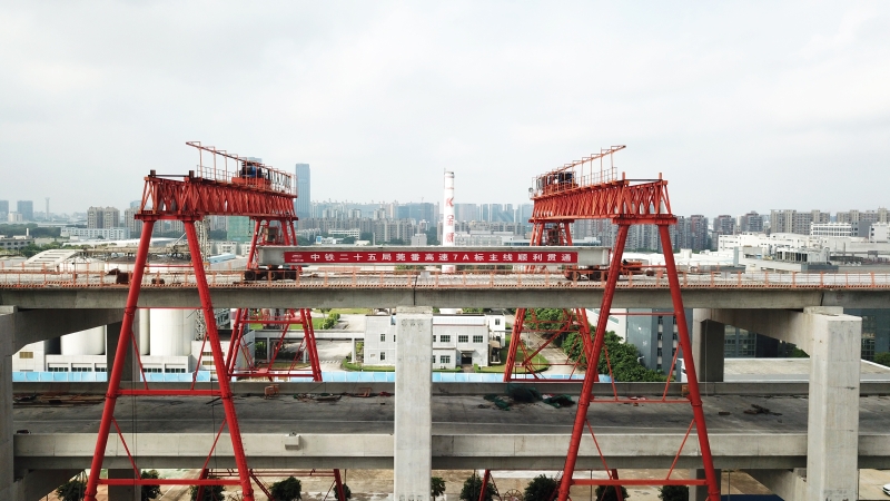 据中铁二十五局项目负责人李凯介绍,左右线莞樟路1号特大桥长1187.85米,跨越东莞市最繁忙的交通主干道——莞樟路,为有效利用土地资源,该桥采用双层箱梁设计,共需架设384片箱梁。最后一片箱梁架设点位于该桥左线12号墩至13号墩,上跨莞樟路下沉式隧道、毗邻生态园大道。施工中,运梁作业需穿越多个繁忙镇区,线路长、弯道多,架梁点高度28米,梁面横坡最大达6%,施工工况复杂、安全风险极高。针对运梁路线特点,建设者深入研究运梁路线,开展实地模拟,制定周密的运梁方案,选择夜间车流量最少时间段运梁,实行专人跟车,降低施工风险。