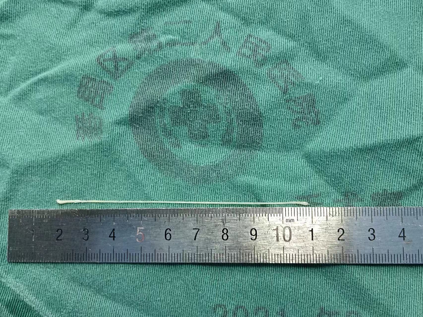 脑裂头蚴取出手术成功的标志是将头节完全取出,“脑裂头蚴头很大,前面还有一个裂口,这也是它得名的原因。”闫学强说,当看到虫子头节完全被取出来的时候,自己才放心下来。虫子被取出后,被放置在手术托盘内,仍在不停蠕动。经测量,这条裂头蚴虫体长约10厘米。