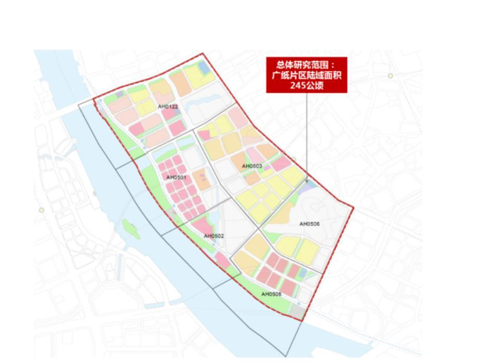 本次规划修改的总体研究范围为广纸片区245公顷。其中,规划实施评估、区域景观环境营造专项、历史文化资源保护专项、公益性设施开发建设方案等专项规划以广纸片区245公顷为工作范围。
