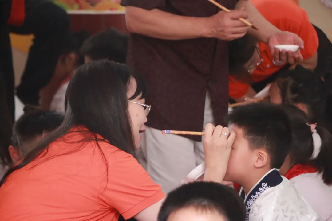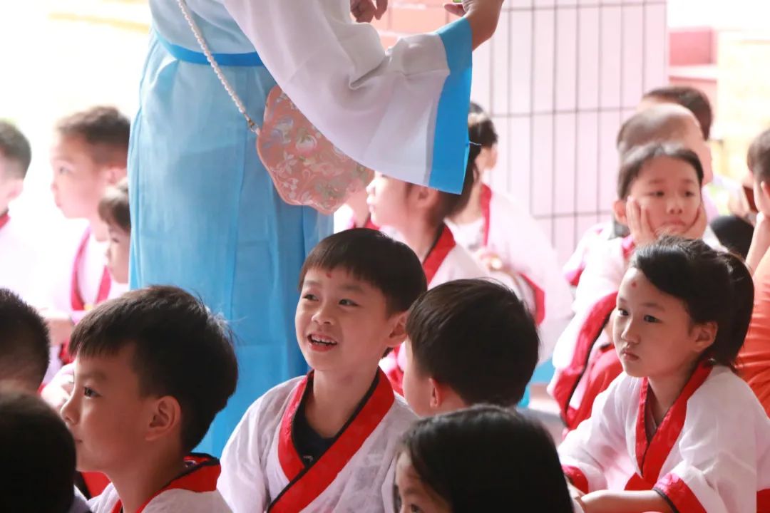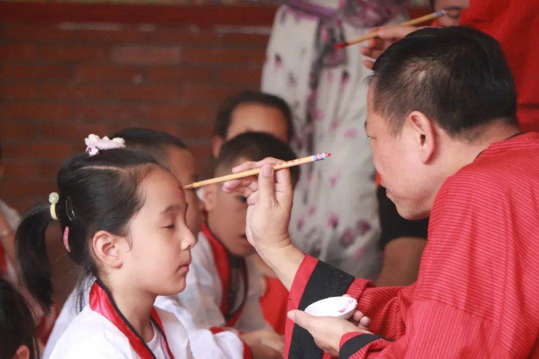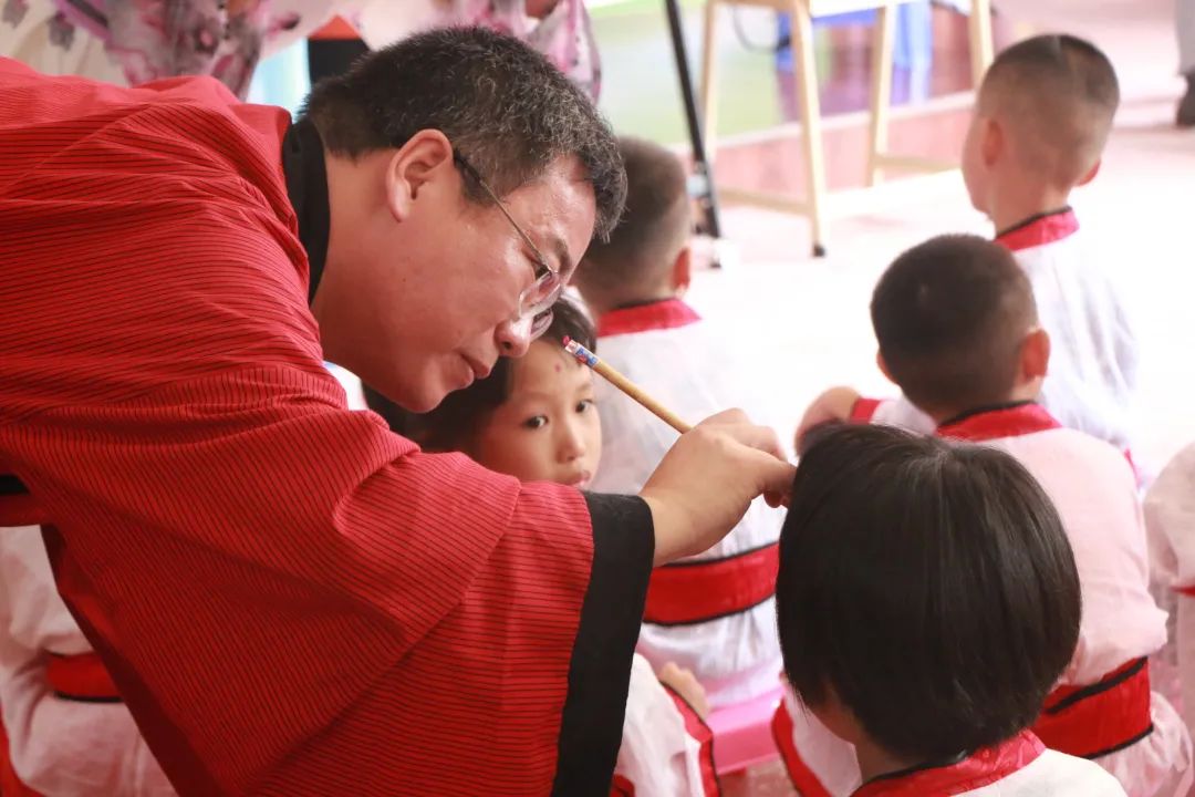 朱砂启智环节,校领导、嘉宾和班主任分别为新生点朱砂,祝福孩子们从此心明眼亮,好读书、读好书。