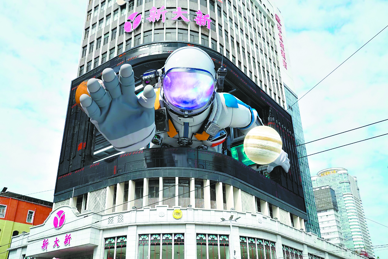 “新大新”外立墙上采用裸眼3D技术的巨型LED屏幕,宇航员“伸出”手来,向市民游客“打招呼”。