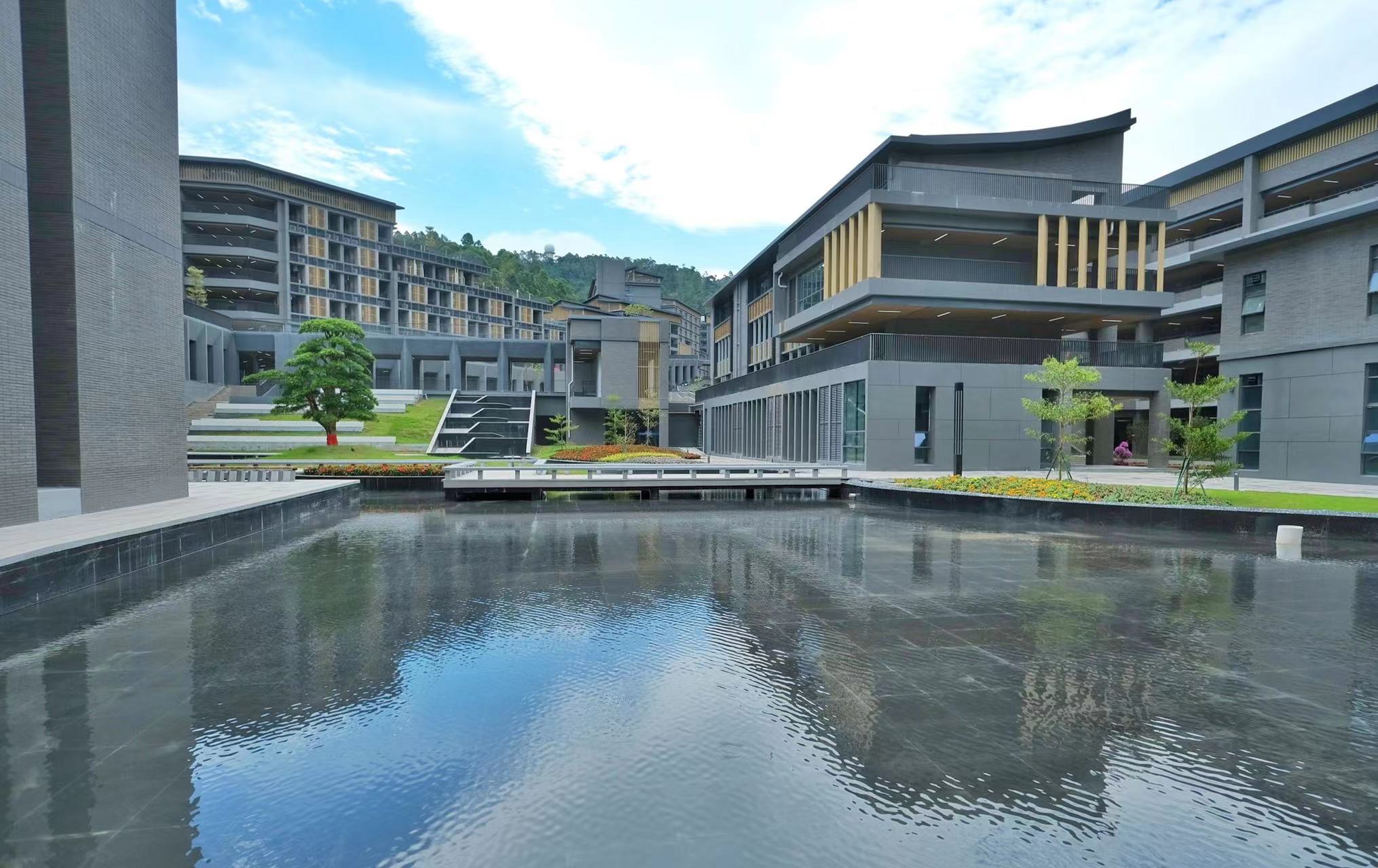 省实白云校区的校园设计出自中国工程院院士何镜堂之手,整体规划理念围绕“山水书院、龙凤呈祥”展开:基于家长望子成龙的期盼,利用凤凰山山势,置入一个从高处流往低处的连续景观水体,让山、水融为一体;建筑物以院落式布局为主,让园林空间、教学空间、生活空间和礼仪空间相互渗透,形成积极的互动关系。
