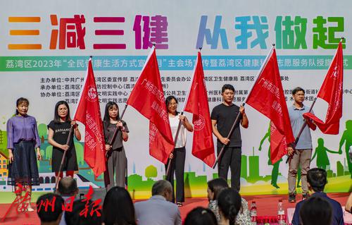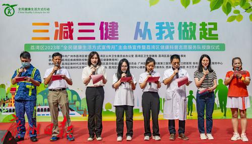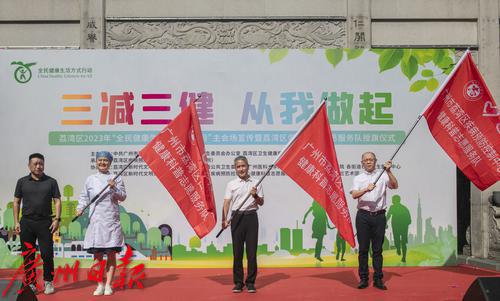 8月31日上午,“荔湾区2023年‘全民健康生活方式宣传月’ 主会场宣传暨荔湾区健康科普志愿服务队授旗仪式活动”在仁威庙广场举行。2023年9月1日是第17个“全民健康生活方式日”,9月份是全民健康生活方式宣传月。活动现场,来自荔湾区疾病预防控制中心、广州医科大学附属第三医院、荔湾区口腔医院、多宝街道社区卫生服务中心的专家为居民就“三减三健”、常见慢性病防控、中医健康保健、精神心理健康等相关内容开展科普宣传。
