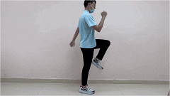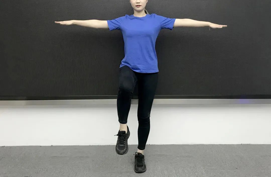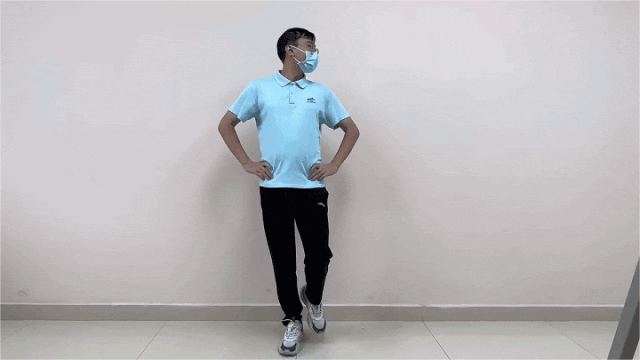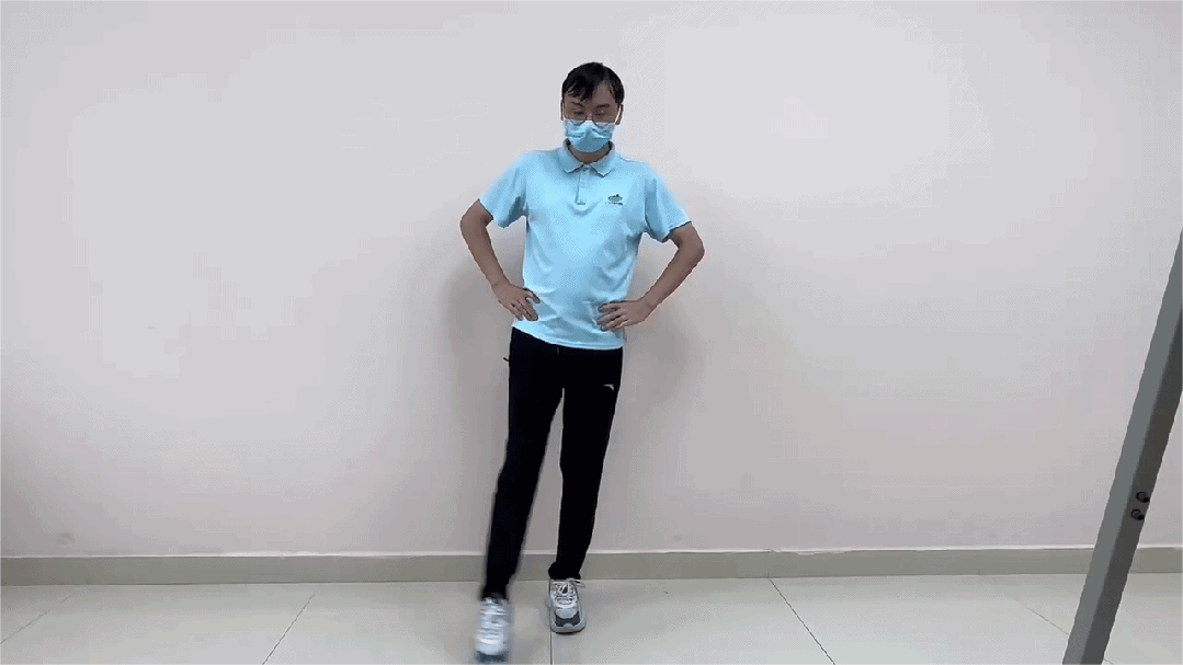 先维持单腿站立稳定,手叉腰保持上半身和骨盆稳定,再进行另一侧下肢摆动。