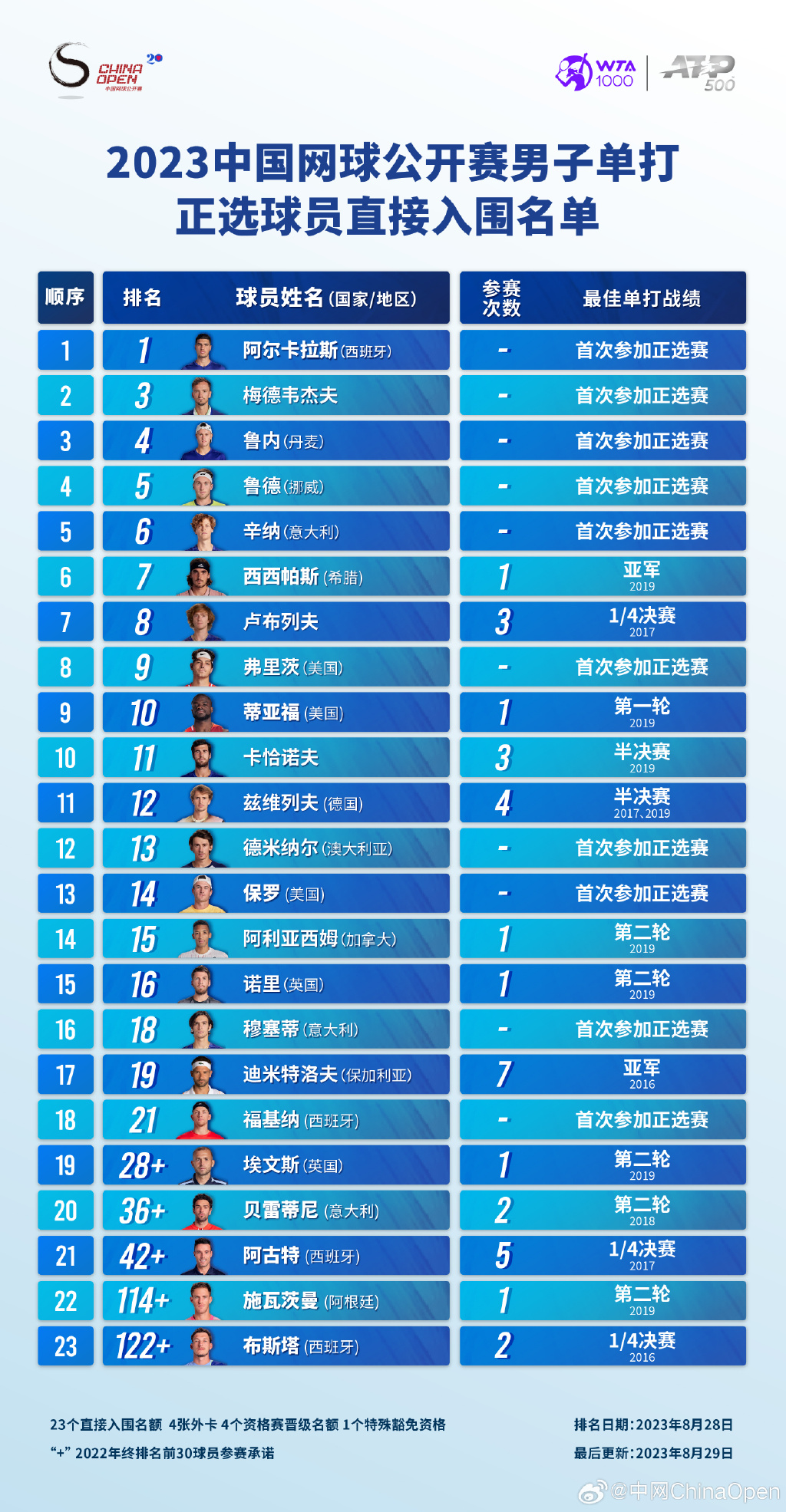 北京时间8月31日,距离2023年中国网球公开赛开幕还有26天,赛事官方在国家网球中心钻石球场发布了今年ATP单打正选球员阵容。现世界前十中,包括世界第一阿尔卡拉斯、前美网冠军梅德韦杰夫在内的9位将出战2023年中网。