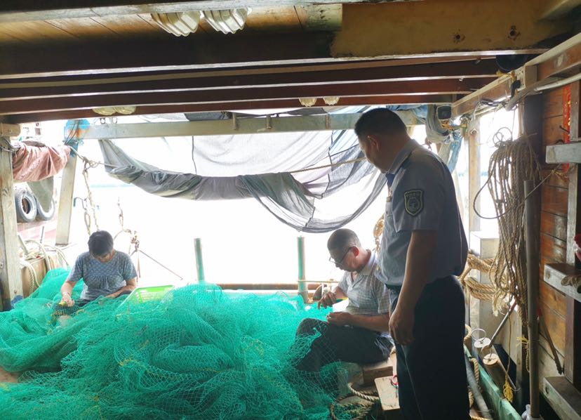 渔民周先生告诉记者,之前他在珠海桂山一带捕捞,接到番禺区海洋综合执法部门发送的台风预警信息后,他于8月30日中午12时前就把船开回来了,现在正安排人员修补网具,待会就把船开进下涌水闸里面的锚地停泊,那样会更加安全。
