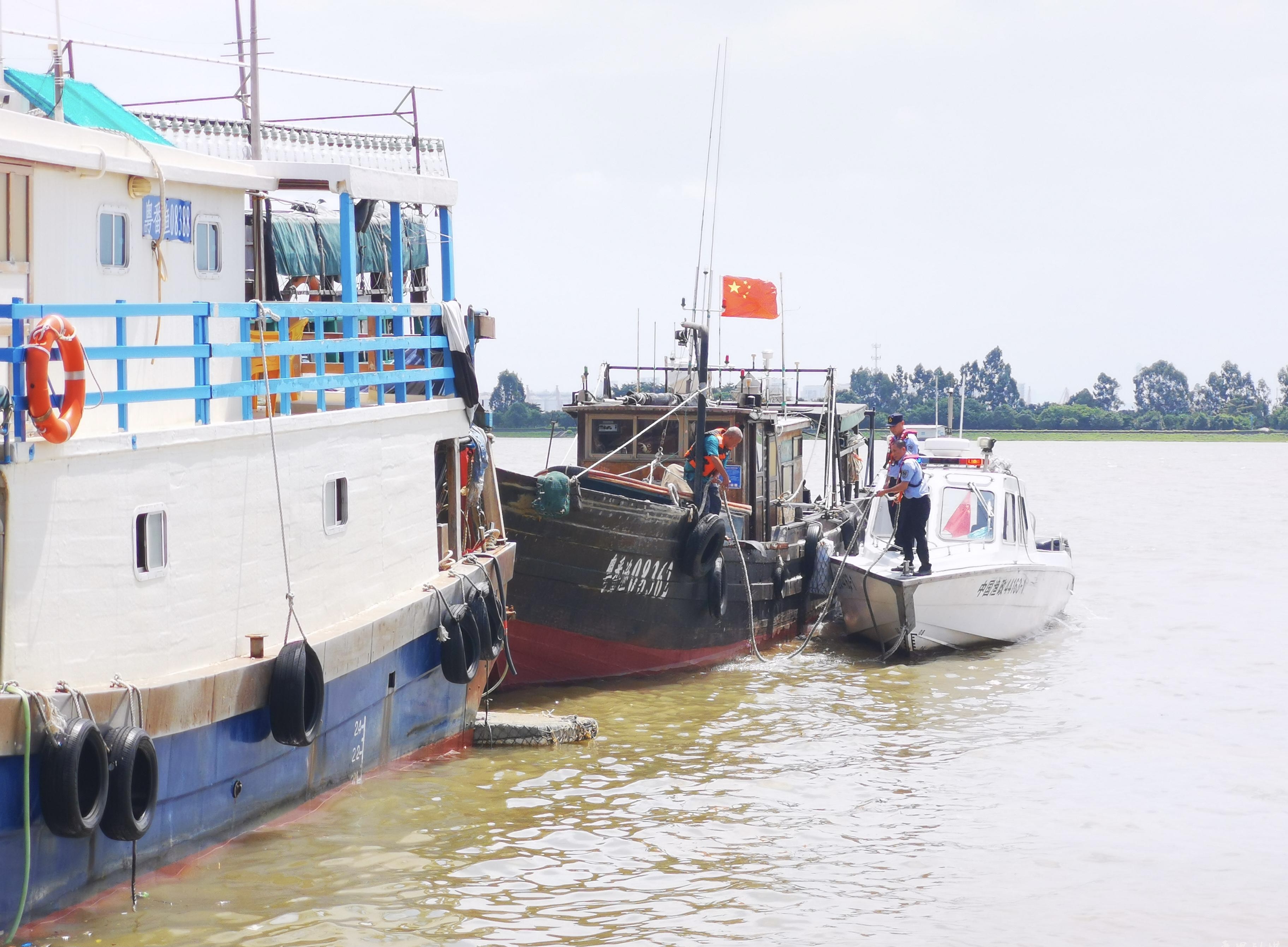 8月31日上午,记者在莲花山中心渔港看到,江边及锚地停泊着密密麻麻的渔船,番禺区海洋综合执法大队联合相关部门在锚地、停泊点水域巡查,检查渔船停泊是否安全,查看绳缆固定、人员滞留、防风避浪等情况,确保在港停泊渔船锚泊固定、拴紧缆绳。