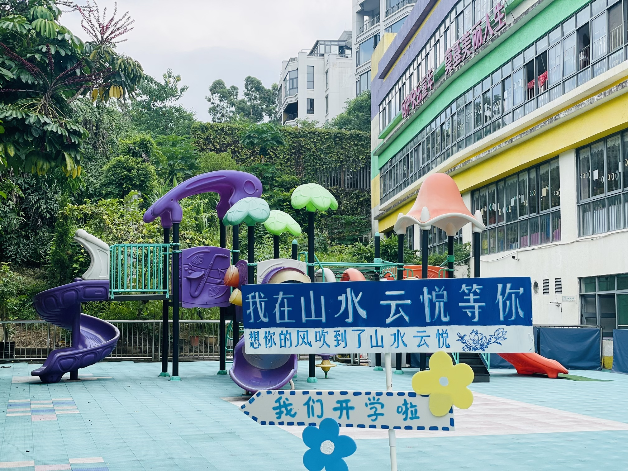 广州市白云区山水云悦幼儿园于2023年7月由民转公。幼儿园位于山水庭苑小区内,依山而建,园舍独立完整,布局合理,环境优美,空气新鲜,视野开阔,恰似一座天然氧吧。全园占地面积5700平方米,建筑面积4480平方米,户外活动面积为3398平方米。幼儿园设有图书室、美工室、科学室、小厨房、演播厅等功能室,户外有篮球练习场、30米跑道、水池、沙池、种植园、大型玩具区等。