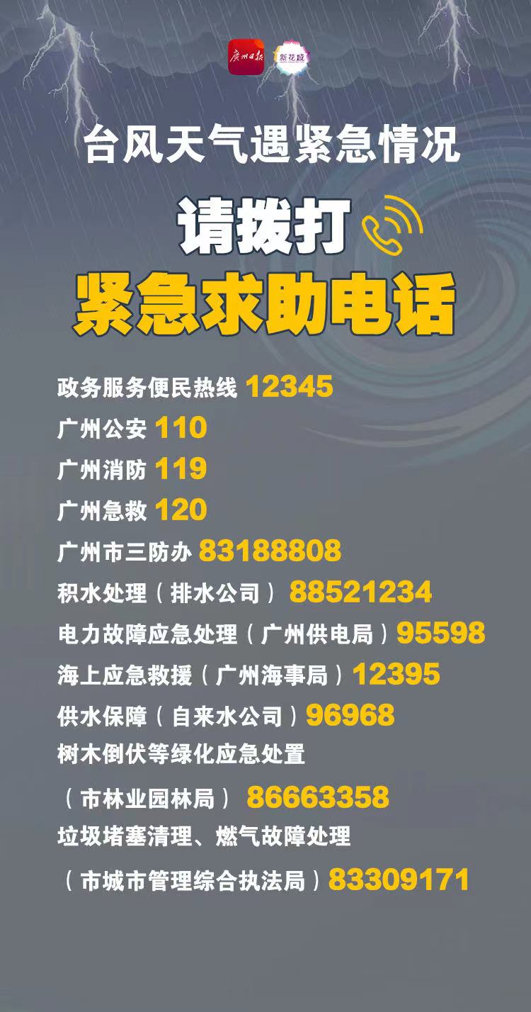 台风天气如遇紧急情况,请拨打广州市防台风相关部门紧急求救电话:详情>>>