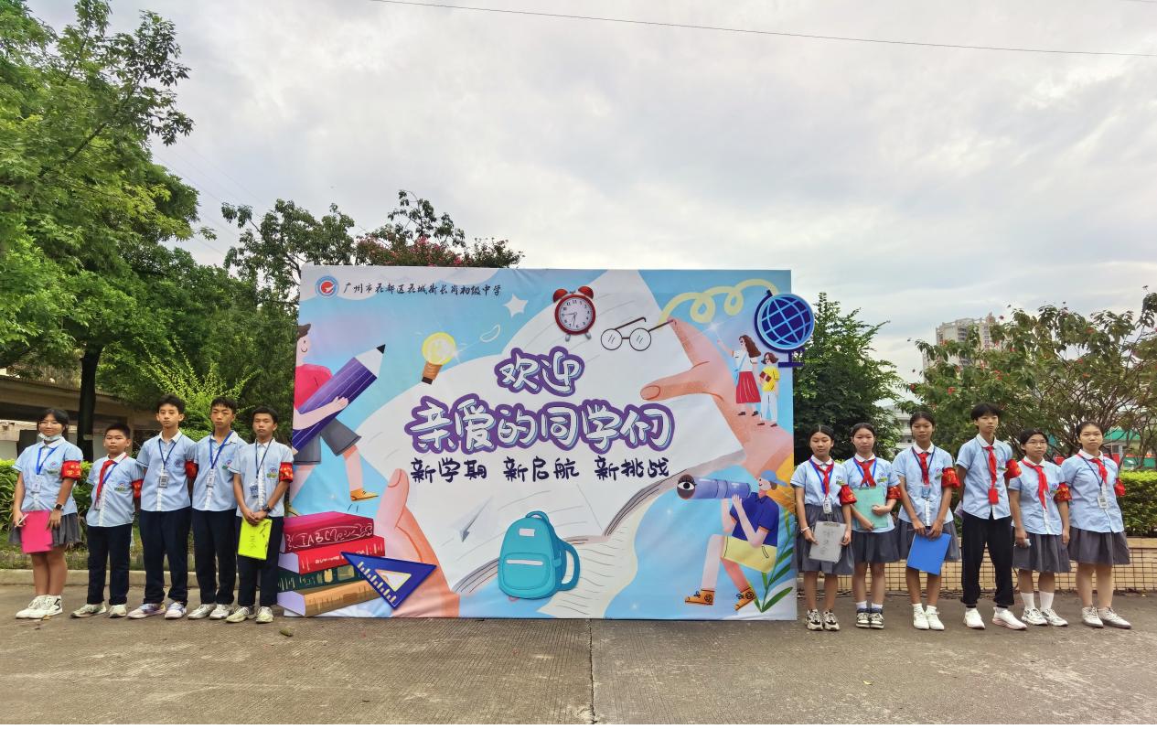 开学这一天,花都区长岗中学校园里出现鲜亮醒目的迎新标识。