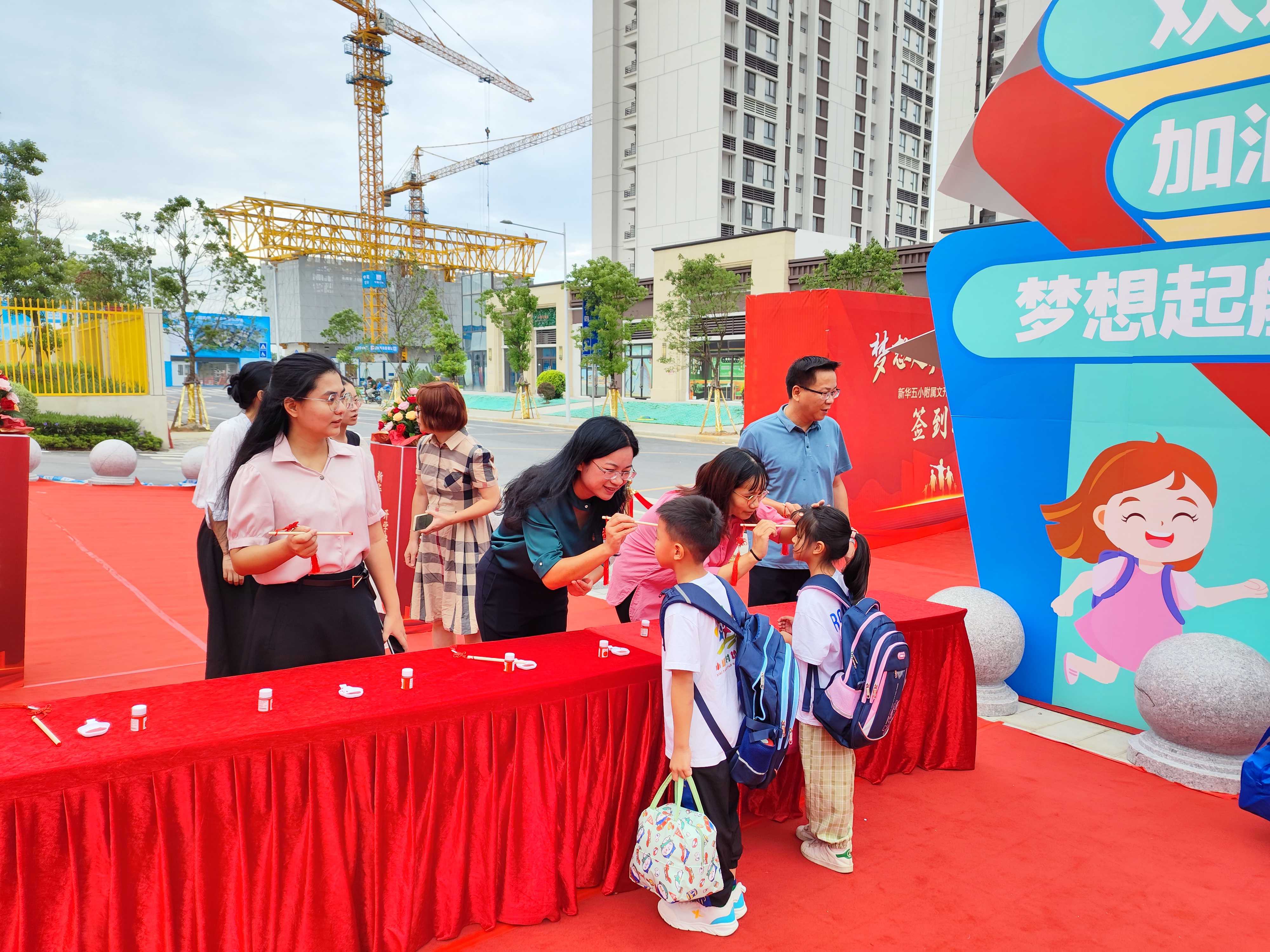 9月1日上午,今年新开办的广州市花都区新华五小附属文升小学以“梦想起航 开启希望”为主题,举行学校的第一个开学典礼。开学典礼前,学生们陆续来到学校后,该校校长毕玉莲和老师们、家长代表执笔,在学生们点朱砂。