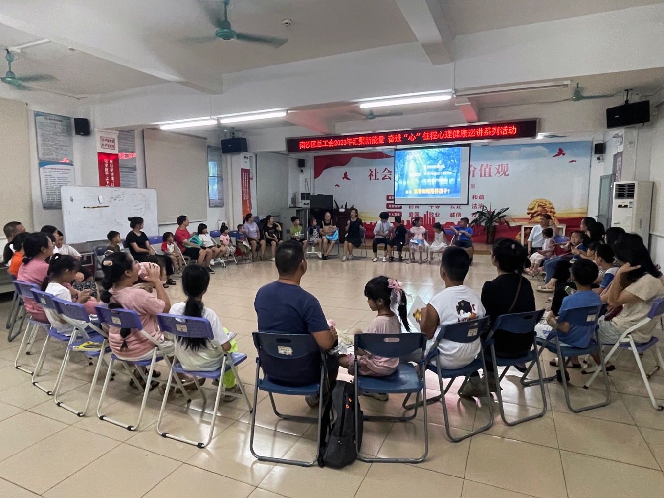 亲子模仿扮演小动物、参与互动游戏……一堂别开生面的心理课程在东涌镇太石村开讲。8月29日晚,广州市南沙区总工会“汇聚新能量 奋进‘心’征程”心理健康巡讲系列活动首场活动在东涌镇启动。首场活动主题为亲子戏剧体验,邀请辖内职工亲子家庭约60余人,在游戏中缓解心理压力,增进亲子关系,探索良好的亲子互动方式。