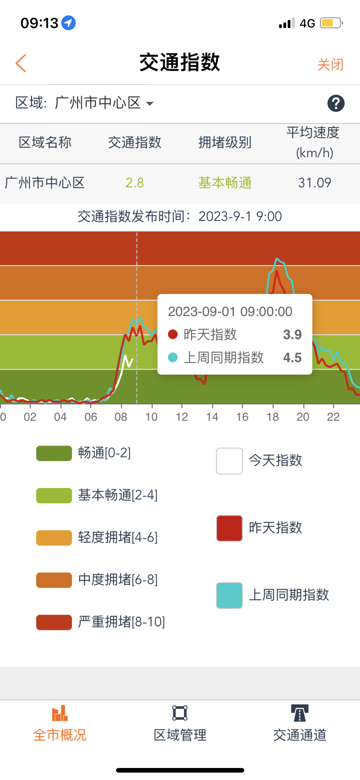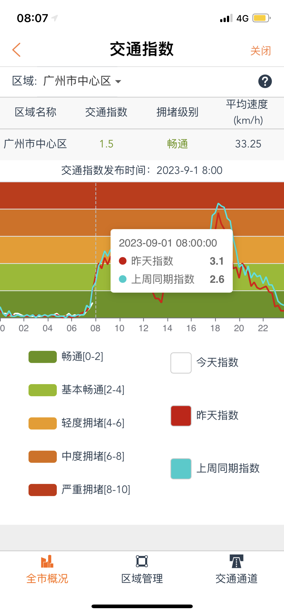 9月1日8点,广州交通行讯通显示,广州市中心区交通指数为1.5,拥堵级别为畅通;昨天指数为3.1,上周同期为2.6。从区域来看,天河商圈、珠江新城、流花等区域整体处于畅通或基本畅通级别。
