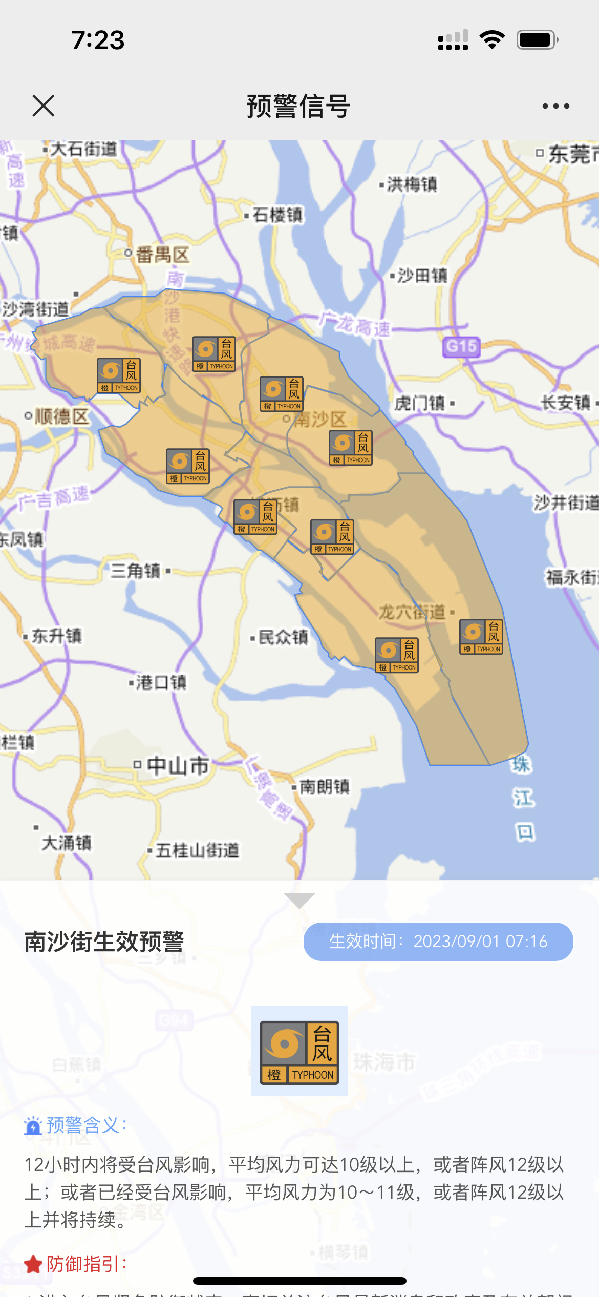 9月1日7:16,南沙发布台风橙色预警信号。