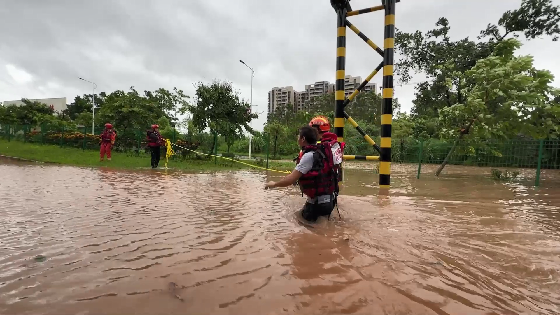 消防救援人员带上救生衣向被困人员迈去,由于水下情况不明,消防救援人员小心翼翼地接近车辆。到达车辆旁,消防救援人员让男子穿上救生衣,随后扶着他沿着原路离开积水区。经过5分钟的紧张救援,被困人员被成功救出,现场无人员伤亡。