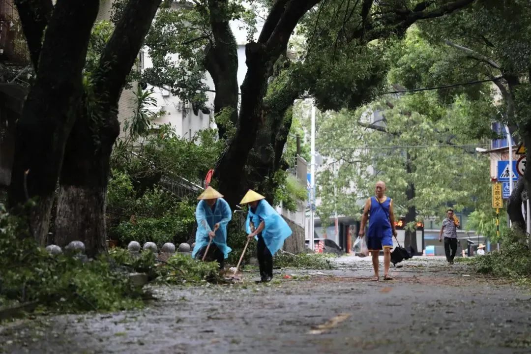 台风过境之后,清晨,交警、医护人员、园林工作者、城管人员、供水供电人员、消防人员纷纷出动,更有无数志愿者、群众,大家纷纷走上街头。