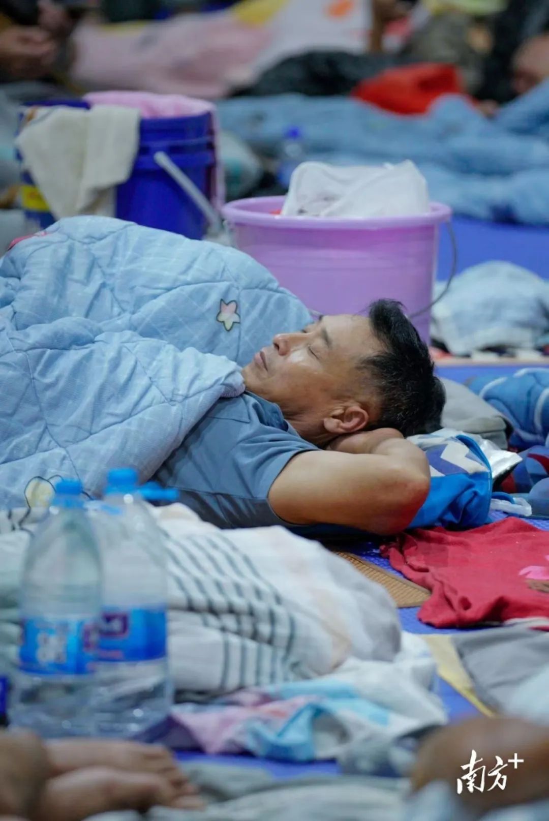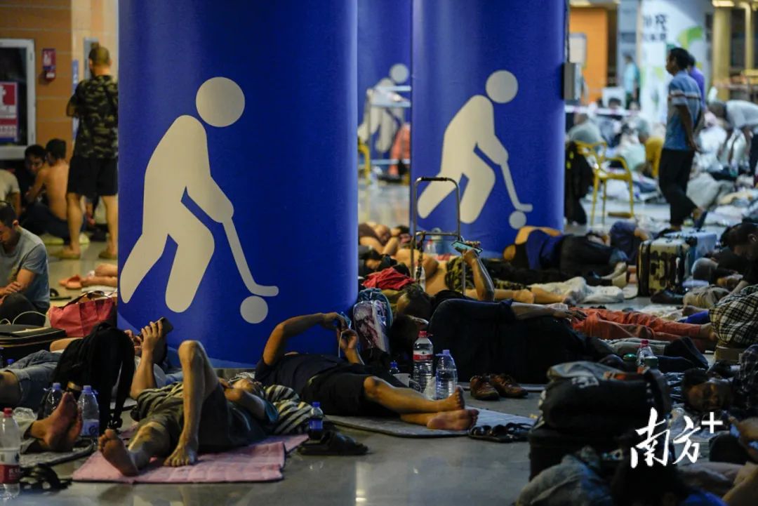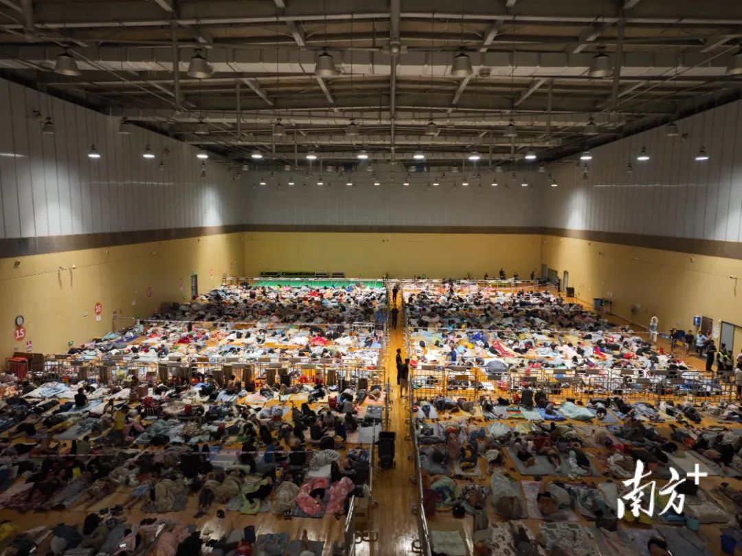 昨夜,来自周边十个项目的3917位工友被转移安置在深圳湾体育中心。尽管体育中心外倾盆大雨,但体育中心里灯火通明,工友们有说有笑,仿佛“苏拉”仍在千里之外。