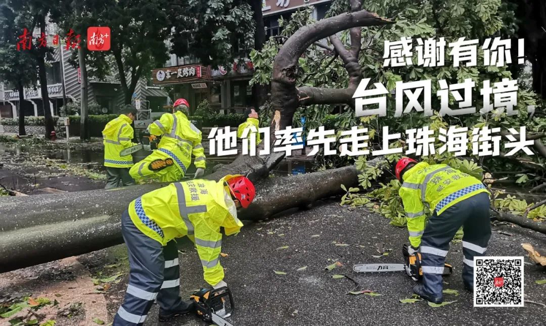 △在珠海香洲区园山路,环卫工人快速清理树路障,以便居民出行。图源:珠海特区报