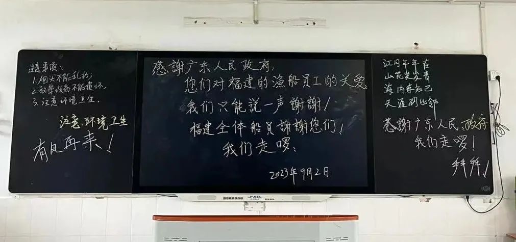 离开前,在横沥小学临时安置点的黑板上,渔民们写下了满满一黑板的话语,对台风期间得到的救助和温暖表示感谢。