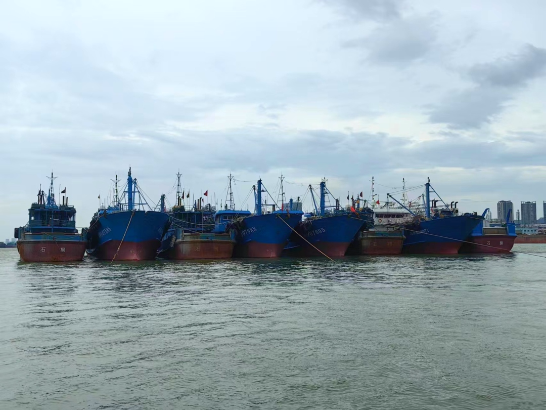 9月1日下午3时,在执法大队执法快艇的护送下,10艘福建籍渔船全部停靠明珠湾大桥水域,179名船员全部转移至岸上避险点避风。