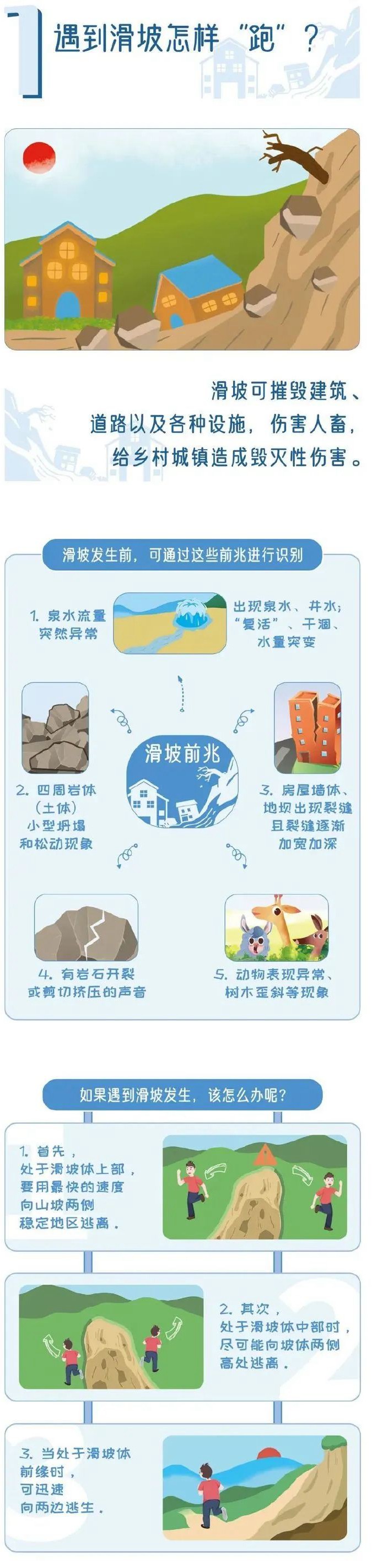 1.若处于滑坡体上部,要用最快的速度向山坡两侧稳定地区逃离。