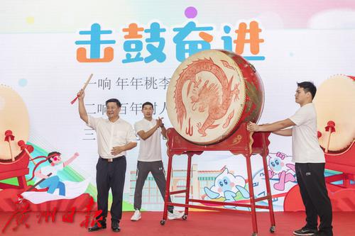 在老师、同学们的欢呼声中,全汉炎校长击鼓三下。
