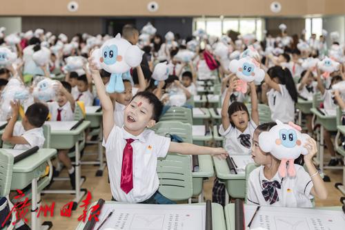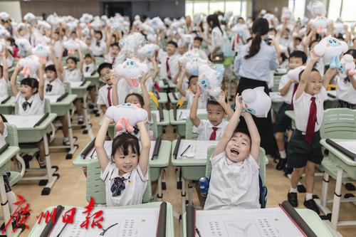 开笔礼成,全校长带上云城老师们给每位新生赠送的“云仔”“云妮”公仔和省实书包,孩子们在激动和喜悦的心情中,开启人生新篇。