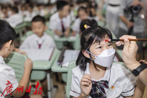 全汉炎校长为同学们点朱砂。一个个带有特殊意义的印记将成为每个孩子在新学期里的独特标志,承载着老师对孩子们的殷殷期盼。