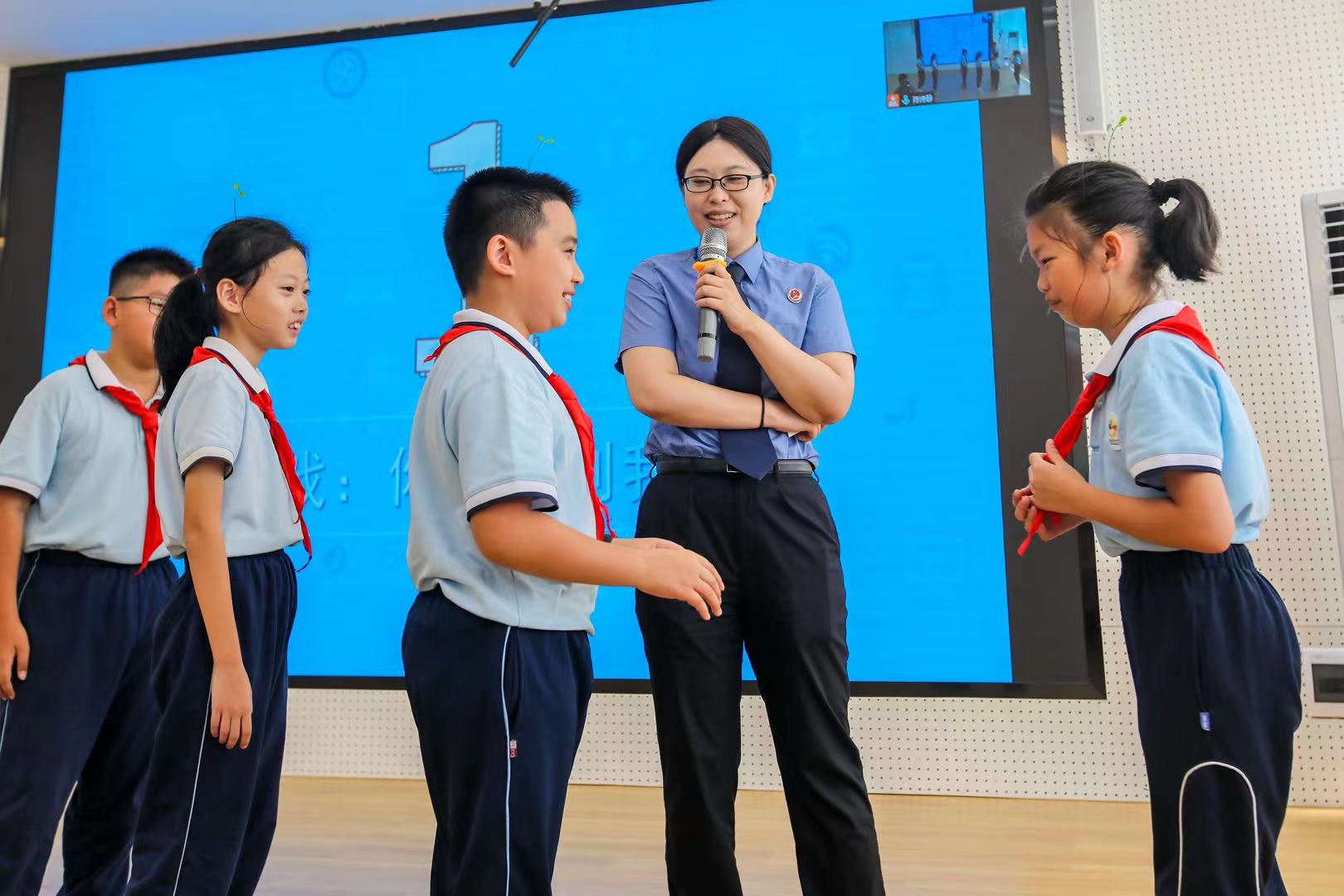 为强化青少年法治意识,越秀区人民检察院检察官苏伊凡还为学生带来《维护网络秩序,人人有责》的网络安全法治课,围绕网络暴力和网络欺凌等重点进行以案说法,并在现场以“你来比划我来猜”的游戏方式,引导同学们认识众多网络信息传播的不文明现象。