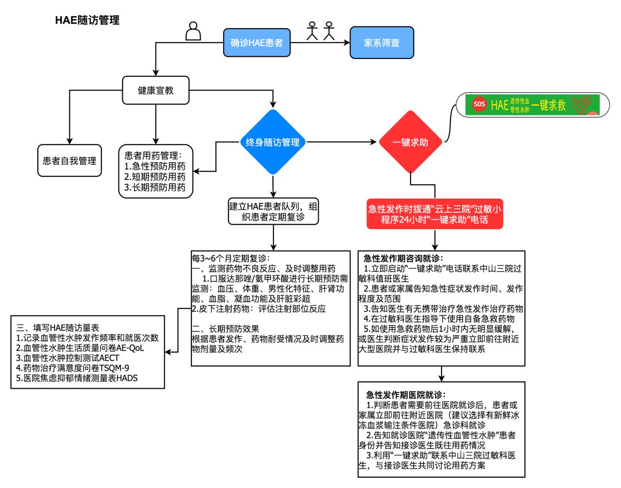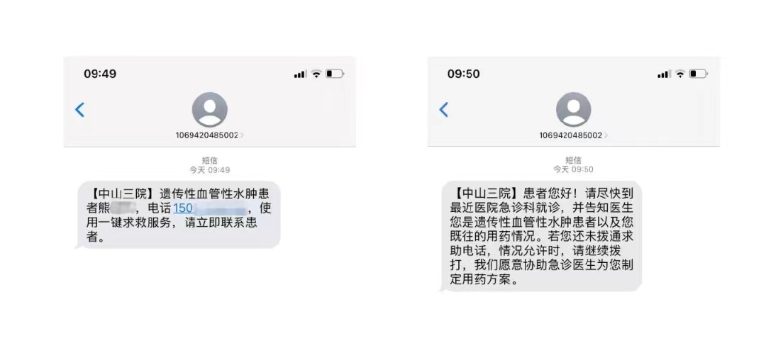 在中山三院,患者一经确诊HAE,医生即可将患者加入“云上三院”小程序的HAE一键求救管理名单中,患者发病时,可通过小程序拨打HAE一键求救电话,该一键求救电话24小时有工作人员值听。患者拨打后界面将会弹出急救指引短信,急救电话接通后,患者按照指引告知医生急性症状发作范围、持续时间及有无随身携带急性发作治疗药物,医生在线指导患者作应急处理。电话未接通时,值班医生会收到患者的求救呼叫信息,患者也会收到急救指引短信,患者根据指引先前往就近医院急诊科就诊处理,医生看到求救电话或短信时,会第一时间回拨协助处理。