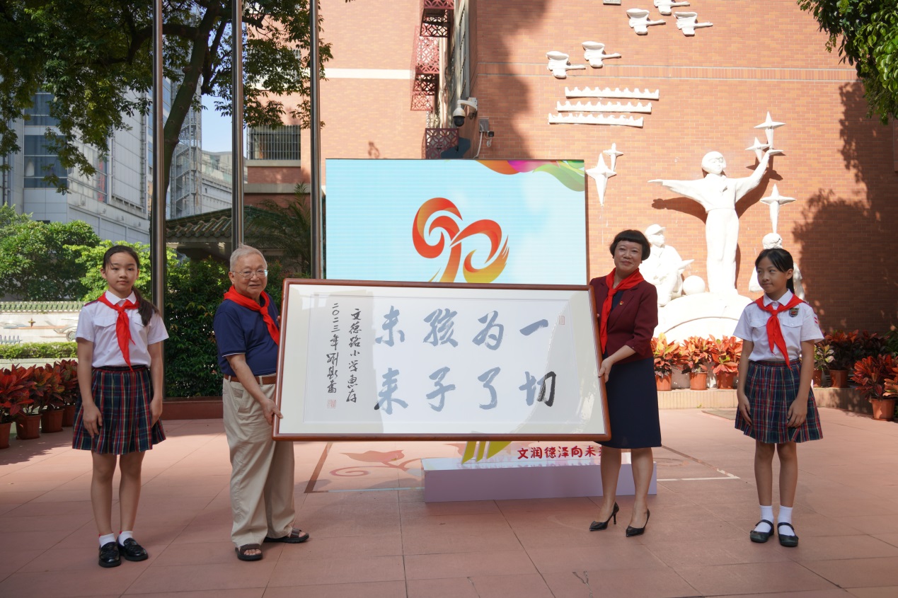 今年还是文德路小学建校九十周年。黄丽芳回顾了文德路小学90年来的发展历程和辉煌成就,并勉励广大学生刻苦学习,勇攀科学高峰。随后,黄校长庄重地接过刘斯奋为学校提写的“一切为了孩子的未来”墨宝。这份墨宝象征着学校的办学理念和使命,黄校长郑重地表示,文德路小学将继续秉承这一办学理念,立足儿童为本,为每个孩子的未来发展奠定坚实的基础。