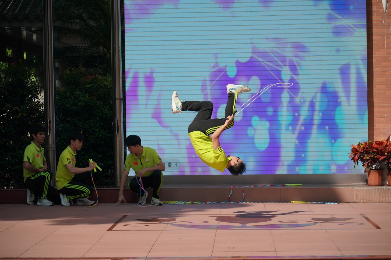 随着充满青春活力的音乐响起,文德跳绳队的队员上台表演花式跳绳,现场气氛再次热烈起来。激动人心的时刻终于到来,四位世界跳绳冠军张崇杨、谢凯宇、陈嘉伟、岑小林登上了舞台,为大家带来了一场精彩的表演。他们代表中国参加了2018-2023年国际跳绳比赛,并多次刷新了世界纪录,为国家争得了荣誉。几位冠军队员身姿优美而矫健,腾空跳跃、翻转腾挪,绳子在他们手中飞舞,不论是单人表演还是多人配合都灵敏协调,令人目不暇接,台下爆发出如潮的掌声。接着,几位世界冠军分享了他们的成长之路,介绍了他们经历的艰辛而充满挑战的旅程,他们勉励同学们只要坚持不懈,勇敢追求梦想,就一定能够取得成功。来自世界冠军的鼓励,让在场的同学们倍感振奋。